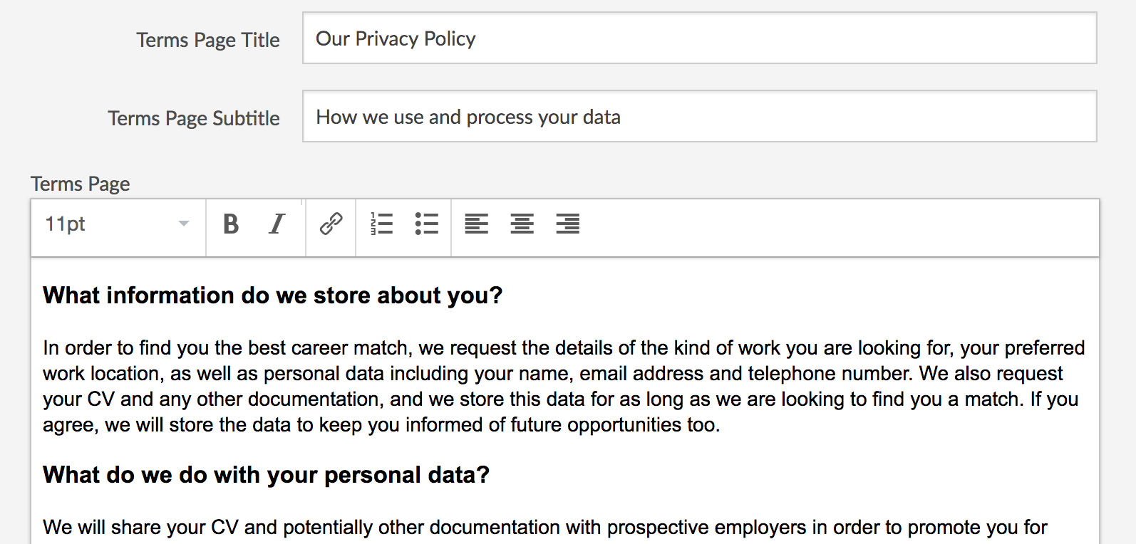 If you visit the account details section in the Settings page, you can add a terms page title and subtitle, and then a rich text version of the terms body: