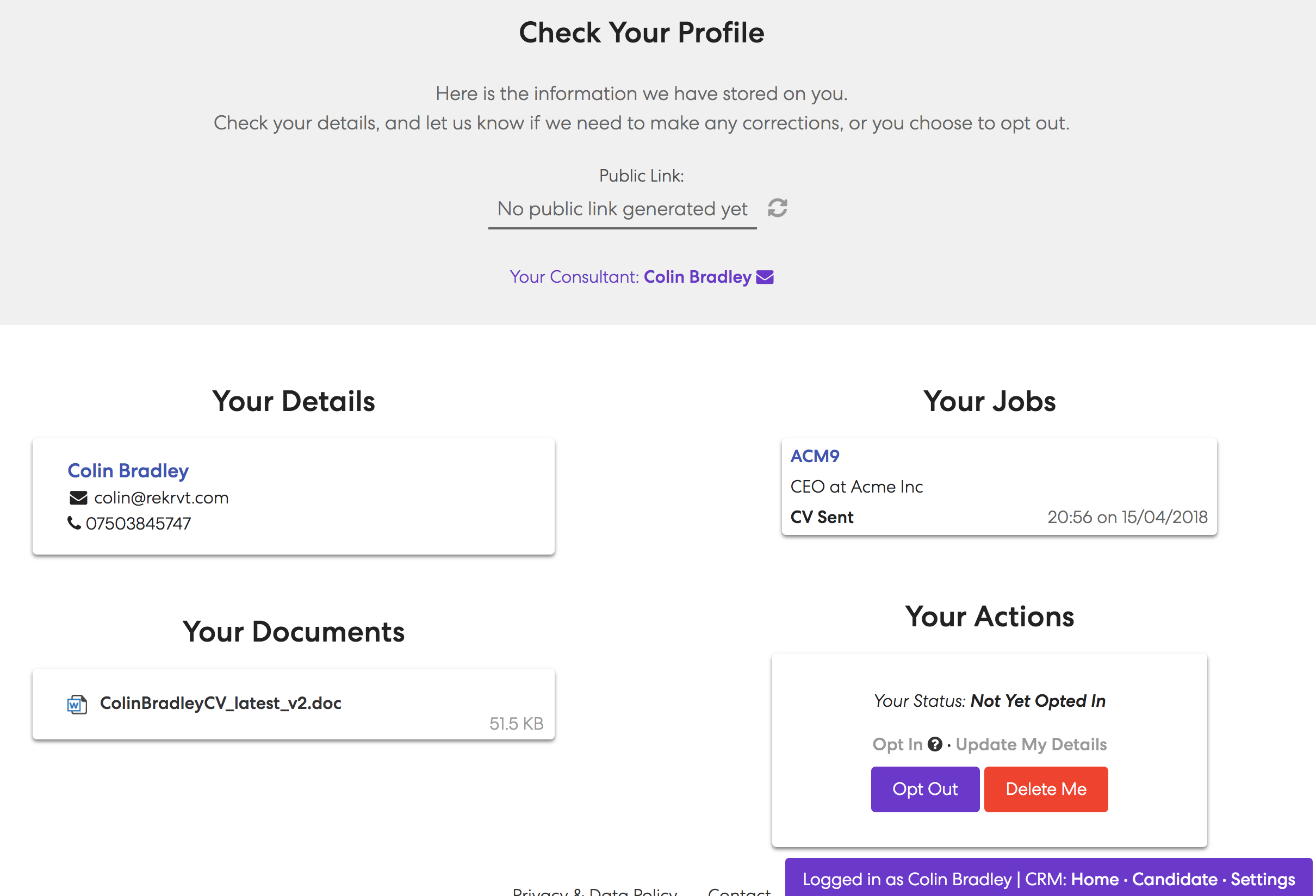 If you would like to allow a candidate to access the personal data you store for them, you can generate a secure link and send it to them from the CRM. This link also allows them to re-submit their data if it is incorrect, opt in or out of any communication, as well as request deletion of their data.