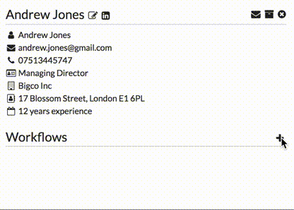When you are viewing a candidate detail page, click the + next to the Workflows sub-header, and a search box will appear. In this box you can search for either the company name, job title, or role identifier. Matching roles will be shown in the dropdown – select the required role, and click the Add button:
