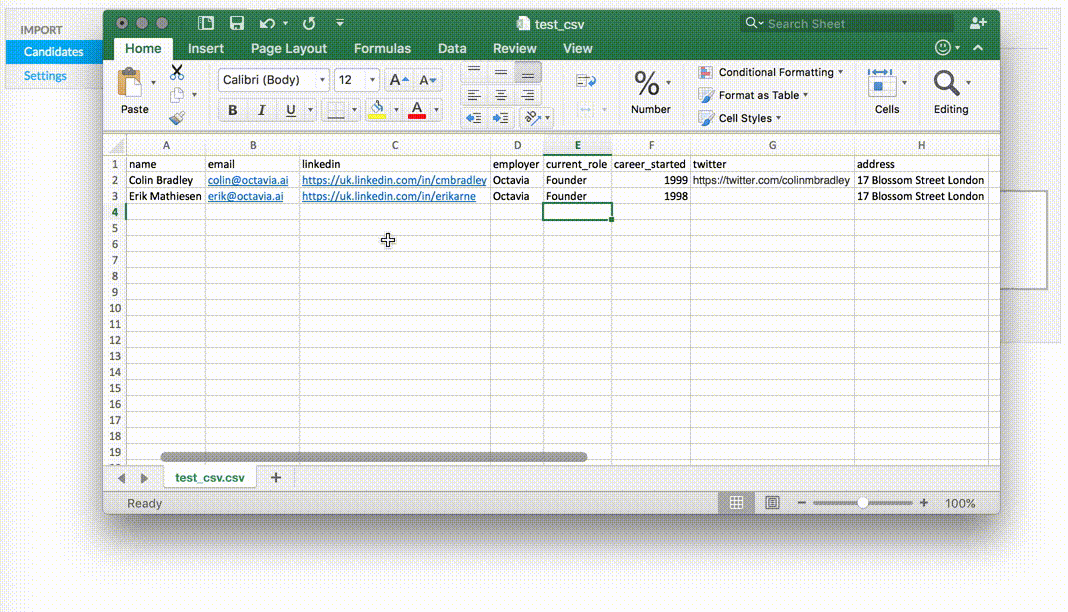 If you have a spreadsheet of candidate data, you can upload this first (before any CV documents) – any CVs uploaded later will be parsed and auto-matched with successfully created records from the CSV file.