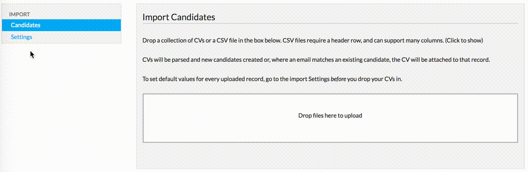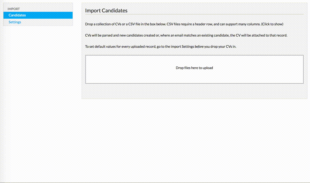 CV uploading is super simple: you just need to drag a collection of CVs onto the upload box, and they will get processed, parsed, and created as candidates, providing the parser can extract all the required information. If you have configured required custom fields, make sure you set defaults for these in the Settings section to ensure that valid candidates can be created.