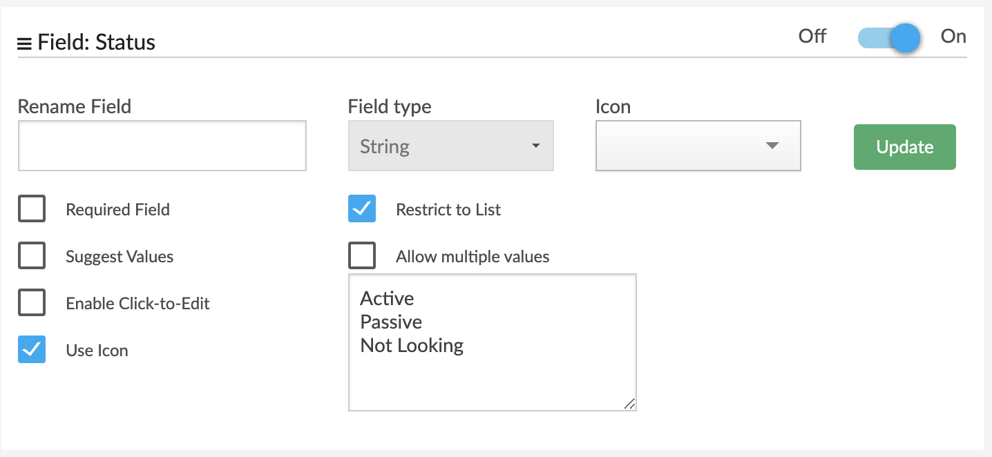 As an example I have a field called “Status” that I want to highlight in green if it is Active and in red if it is “Not Looking”. Here’s how it looks to start with: