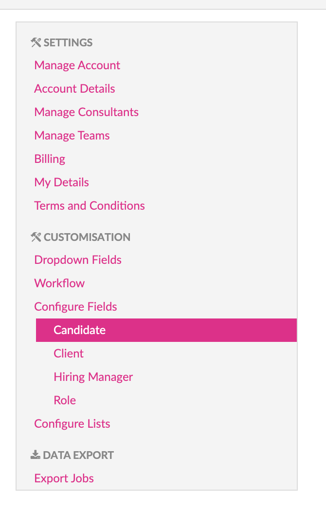 To customise your account go to the Settings and Customisation screen. Among other things the Customisation screen allows for customisation of the fields shown on the input and view screens of all Candidates, Roles, Clients and Hiring Managers.